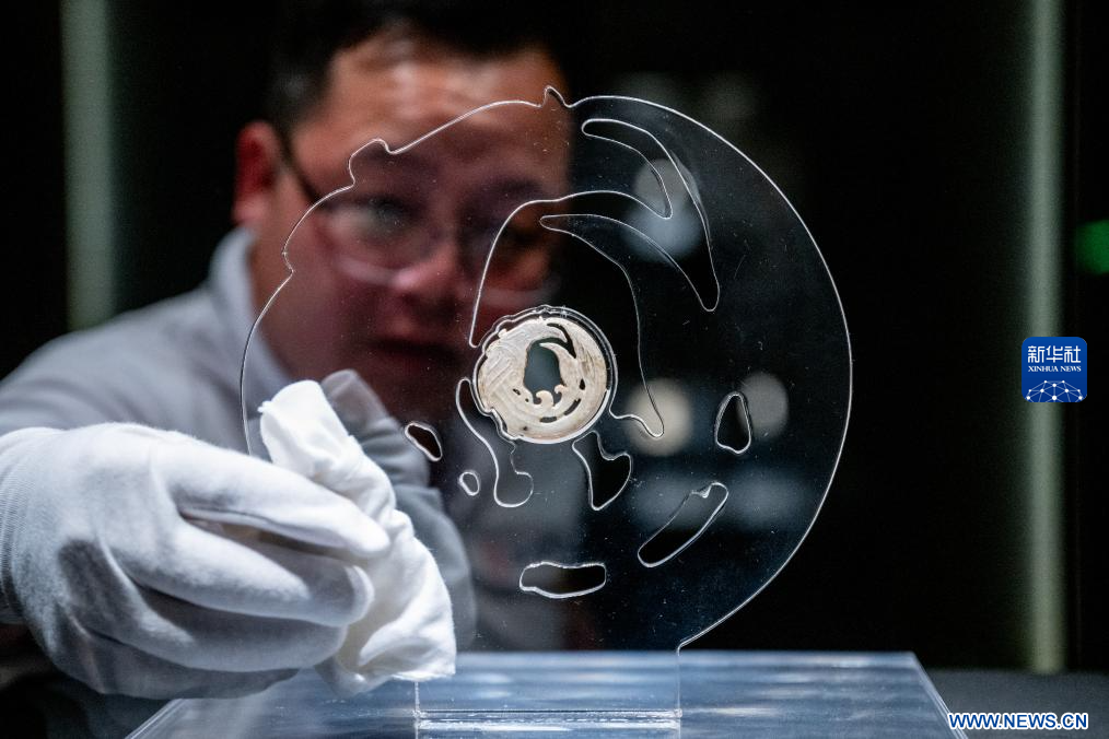 WUHAN, 31 marzo, 2024 (Xinhua) -- Imagen del 30 de marzo de 2024 de un empleado realizando los preparativos para la exhibición del fénix de jade, en el Museo del Sitio de Panlongcheng, en Wuhan, en la provincia de Hubei, en el centro de China. El fénix de jade, que se conserva en el Museo Nacional de China, fue presentado el sábado en la exposición "Jade mitológico de la cultura Shijiahe" en el Museo de Sitio de Panlongcheng en Wuhan. Esta es la primera vez que el fénix de jade regresa a Hubei desde que fue desenterrado en el sitio de Shijiahe en Tianmen de Hubei en 1955. (Xinhua/Wu Zhizun)