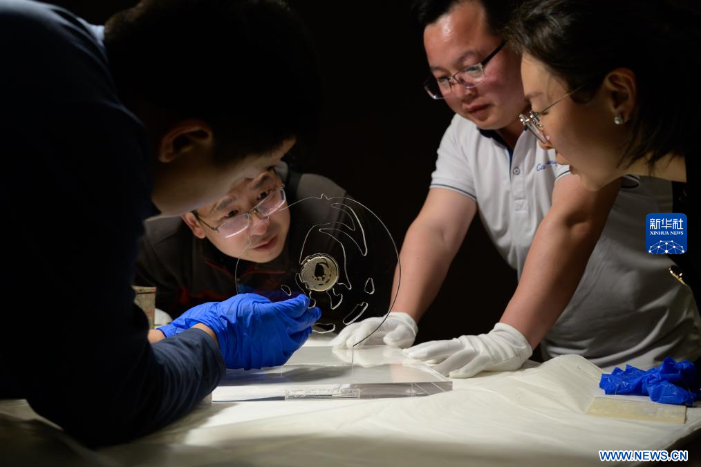 WUHAN, 31 marzo, 2024 (Xinhua) -- Imagen del 30 de marzo de 2024 de empleados realizando los preparativos para la exhibición del fénix de jade, en el Museo del Sitio de Panlongcheng, en Wuhan, en la provincia de Hubei, en el centro de China. El fénix de jade, que se conserva en el Museo Nacional de China, fue presentado el sábado en la exposición "Jade mitológico de la cultura Shijiahe" en el Museo de Sitio de Panlongcheng en Wuhan. Esta es la primera vez que el fénix de jade regresa a Hubei desde que fue desenterrado en el sitio de Shijiahe en Tianmen de Hubei en 1955. (Xinhua/Hu Jingwen)