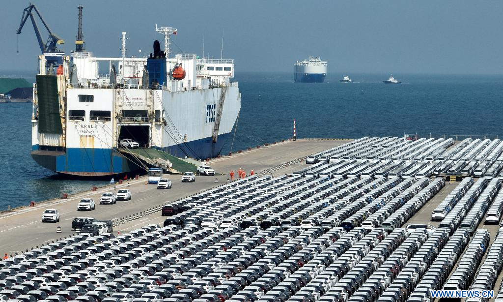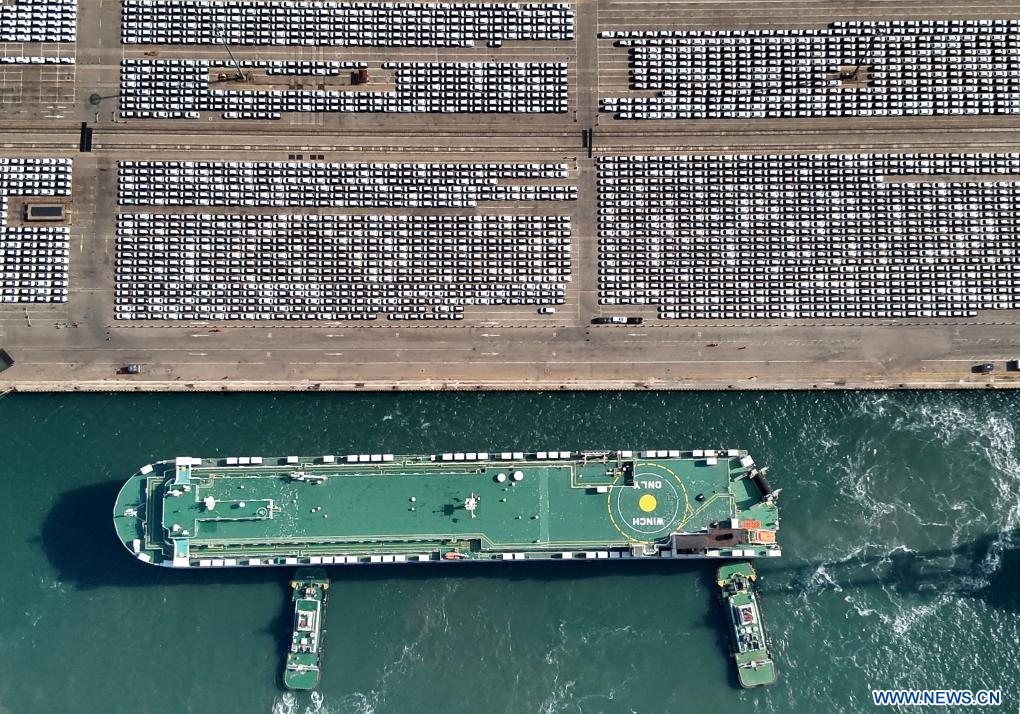 YANTAI, 2 abril, 2024 (Xinhua) -- Imagen aérea tomada con un dron el 1 de abril de 2024 de un buque ro-ro atracado en el Area de la Bahía de Zhifu del puerto de Yantai, en la provincia de Shandong, en el este de China. En los últimos años, el puerto de Yantai ha intensificado sus esfuerzos para construir un centro logístico para vehículos comerciales con sus ventajas geológicas únicas. Ahora ha abierto 14 líneas logísticas globales para vehículos comerciales que llegan a más de 30 países y regiones. El volumen de manejo multimodo de vehículos comerciales del puerto de Yantai alcanzó los 174.000 en el primer trimestre de 2024, un aumento del 25,1 por ciento respecto al mismo período de 2023. (Xinhua/Li Ziheng)