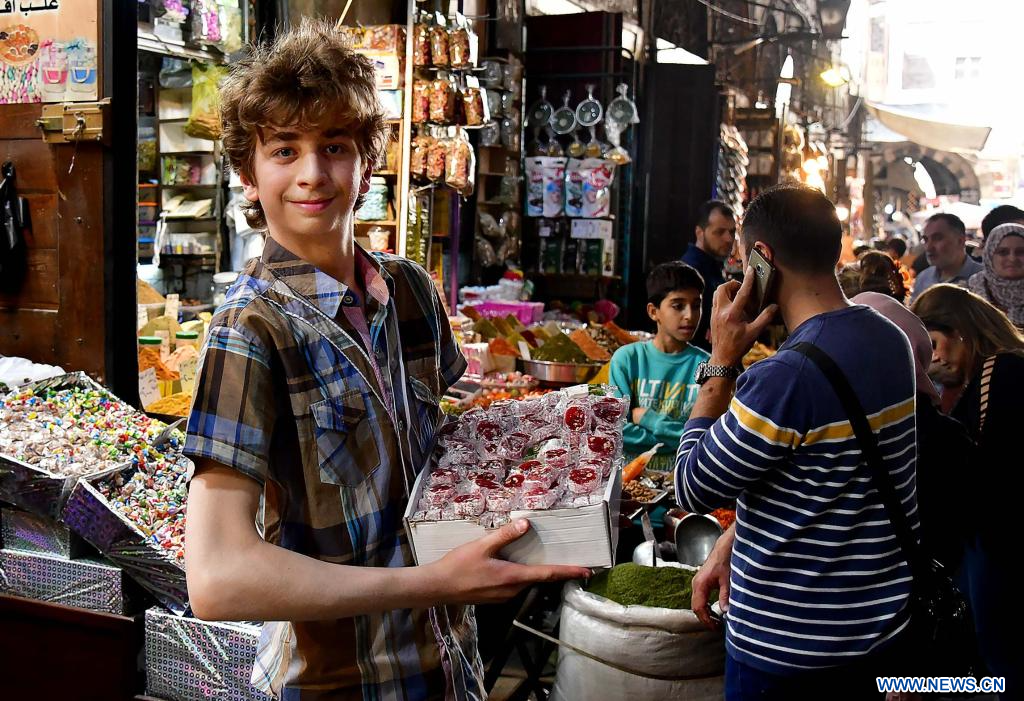 DAMASCO, 5 abril, 2024 (Xinhua) -- Imagen del 4 de abril de 2024 de un niño visto sosteniendo dulces previo al próximo Eid al-Fitr en un mercado, en Damasco, Siria. (Xinhua/Ammar Safarjalani)