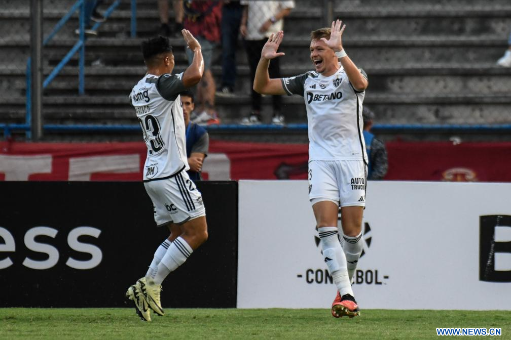 CARACAS, 5 abril, 2024 (Xinhua) -- Imagen del 4 de abril de 2024 del jugador Bruno Fuchs (d), de Atlético Mineiro de Brasil, festejando su anotación con Alan Franco (i), durante el partido correspondiente a la primera fecha del Grupo G de la Copa Conmebol Libertadores, celebrado en el Estadio Olímpico de la Universidad Central de Venezuela, en Caracas, Venezuela. (Xinhua/Marcos Salgado)