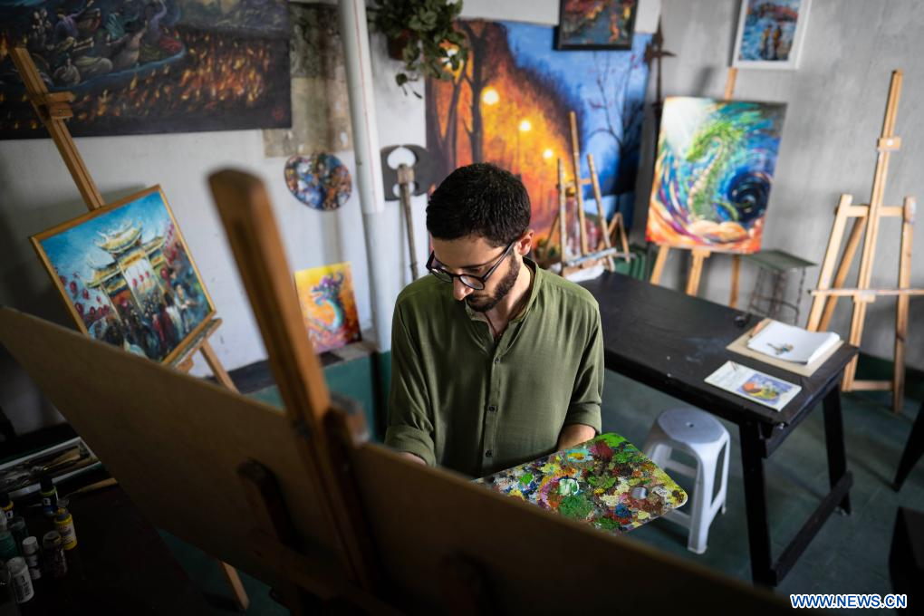 Imagen del 5 de abril de 2024 del artista argentino, Gastón Rovella Spatafore, trabajando en una obra en su taller, en la ciudad de Buenos Aires, Argentina. Una afición por coleccionar piedras semipreciosas desde la niñez se convertiría en el puente que llevaría al pintor argentino, Gastón Rovella Spatafore, a sumergirse en el fascinante mundo de la pintura china, distinguiéndose en la actualidad por ser uno de los pocos artistas del país volcados a retratar la China moderna. (Xinhua/Martín Zabala)