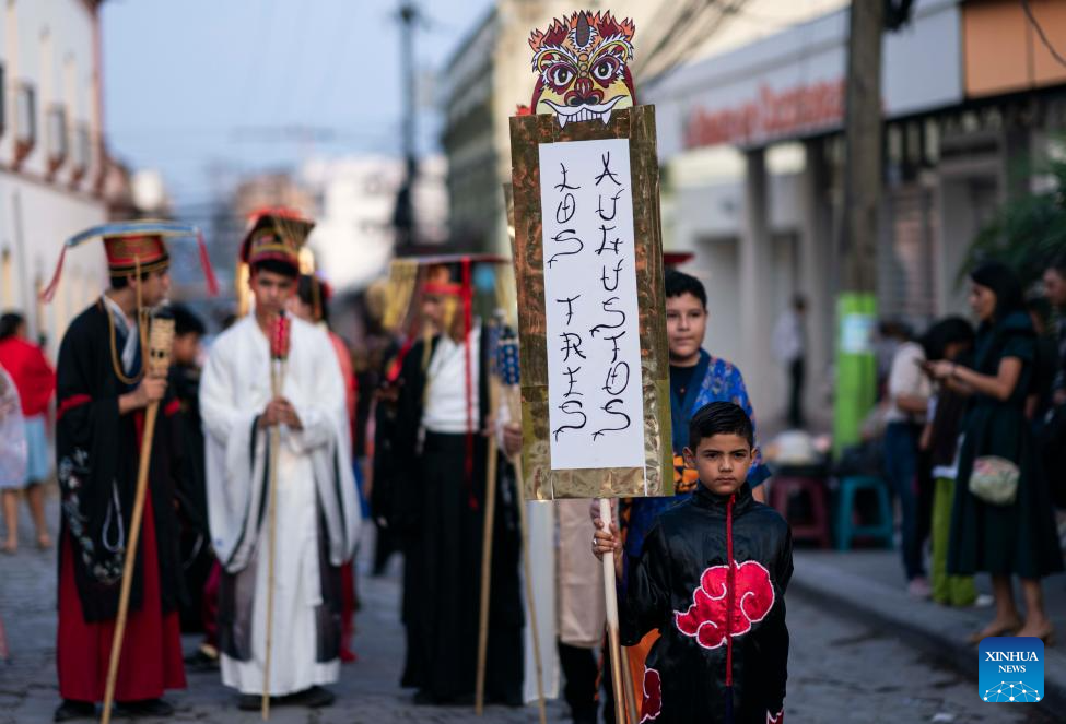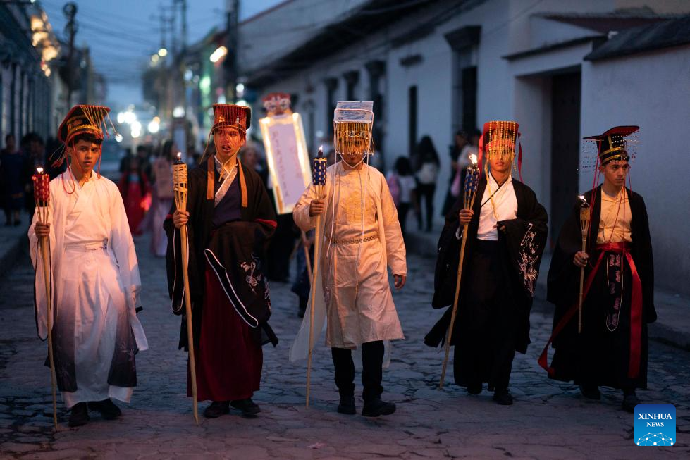 SANTA ROSA DE COPAN, 6 abril, 2024 (Xinhua) -- Imagen del 5 de abril de 2024 de personas participando en el desfile "Festival del Fuego Vivo", que este año tiene como tema la cultura china, en la ciudad de Santa Rosa de Copán, Honduras. (Xinhua/David de la Paz)