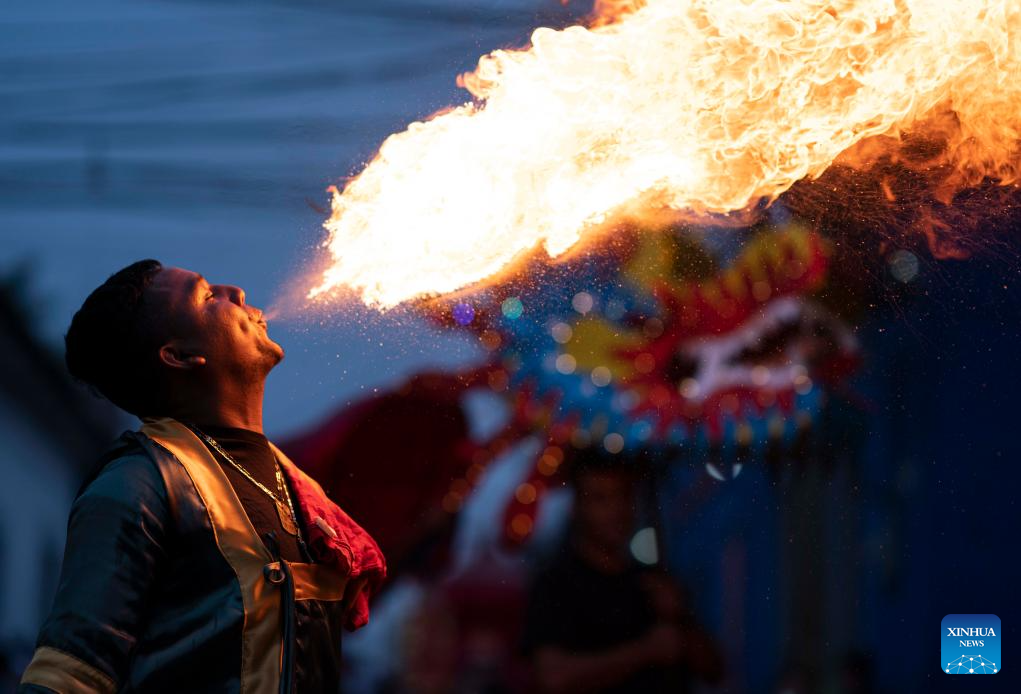 SANTA ROSA DE COPÁN, 6 abril, 2024 (Xinhua) -- Imagen del 5 de abril de 2024 de un artista escupiendo fuego durante el desfile "Festival del Fuego Vivo", que este año tiene como tema la cultura china, en la ciudad de Santa Rosa de Copán, Honduras. (Xinhua/David de la Paz)