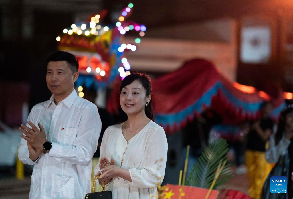 SANTA ROSA DE COPAN, 6 abril, 2024 (Xinhua) -- Imagen del 5 de abril de 2024 del embajador de China en Honduras, Yu Bo (i), y su esposa, Fan Yue (d), participando durante el desfile "Festival del Fuego Vivo", que este año tiene como tema la cultura china, en la ciudad de Santa Rosa de Copán, Honduras. (Xinhua/David de la Paz)