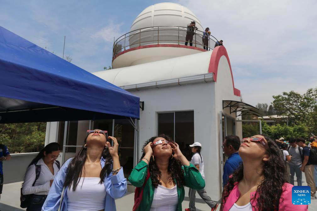 SAN SALVADOR, 8 abril, 2024 (Xinhua) -- Mujeres utilizan gafas especiales para observar el eclipse solar en el Observatorio Micro Macro de la Universidad Don Bosco, en la municipalidad de Soyapango, en el departamento de San Salvador, El Salvador, el 8 de abril de 2024. (Xinhua/Alexander Peña)