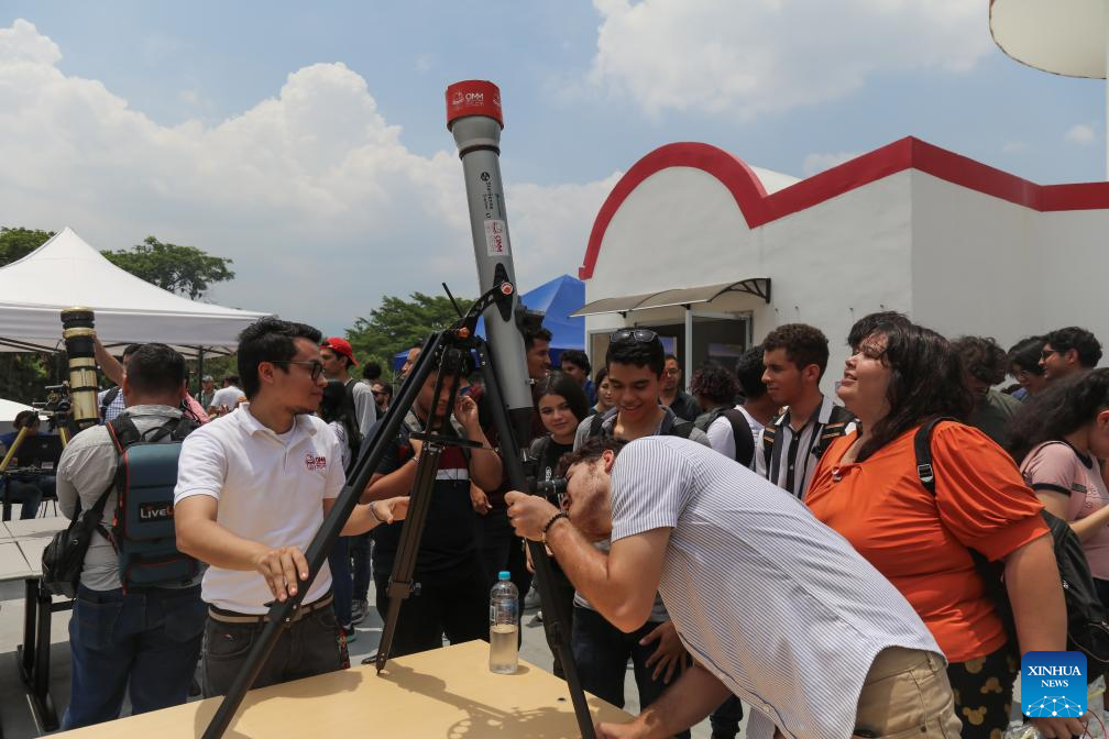 SAN SALVADOR, 8 abril, 2024 (Xinhua) -- Personas usan un telescopio para observar el eclipse solar en el Observatorio Micro Macro de la Universidad Don Bosco, en la municipalidad de Soyapango, en el departamento de San Salvador, El Salvador, el 8 de abril de 2024. (Xinhua/Alexander Peña)
