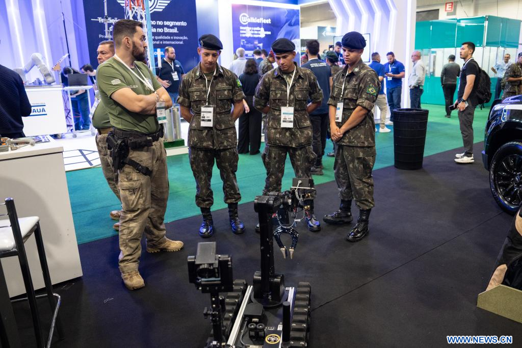 SAO PAULO, 5 abril, 2024 (Xinhua) -- Imagen del 4 de abril de 2024 de visitantes conversando con un empleado frente a un robot a prueba de explosivos en la Exposición Latinoamericana de Espacio y Defensa (LAAD, por sus siglas en inglés) 2024, en Sao Paulo, Brasil. La exposición LAAD 2024 de tres días de duración llegó a su fin en Sao Paulo el jueves. Más de 150 expositores de 20 países y regiones participaron en la exposición. (Xinhua/Wang Tiancong)