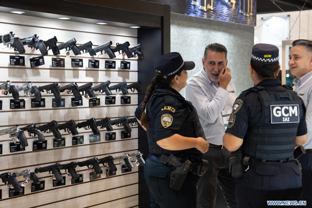 SAO PAULO, 5 abril, 2024 (Xinhua) -- Imagen del 4 de abril de 2024 de empleadas y visitantes hablando en un estand que exhibe armas de fuego en la Exposición Latinoamericana de Espacio y Defensa (LAAD, por sus siglas en inglés) 2024, en Sao Paulo, Brasil. La exposición LAAD 2024 de tres días de duración llegó a su fin en Sao Paulo el jueves. Más de 150 expositores de 20 países y regiones participaron en la exposición. (Xinhua/Wang Tiancong)