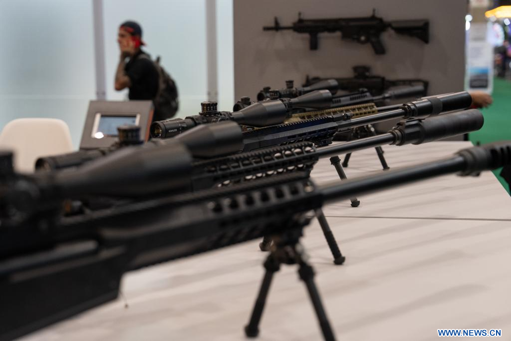 SAO PAULO, 5 abril, 2024 (Xinhua) -- Imagen del 4 de abril de 2024 de un hombre caminando frente a un estand que exhibe rifles en la Exposición Latinoamericana de Espacio y Defensa (LAAD, por sus siglas en inglés) 2024, en Sao Paulo, Brasil. La exposición LAAD 2024 de tres días de duración llegó a su fin en Sao Paulo el jueves. Más de 150 expositores de 20 países y regiones participaron en la exposición. (Xinhua/Wang Tiancong)
