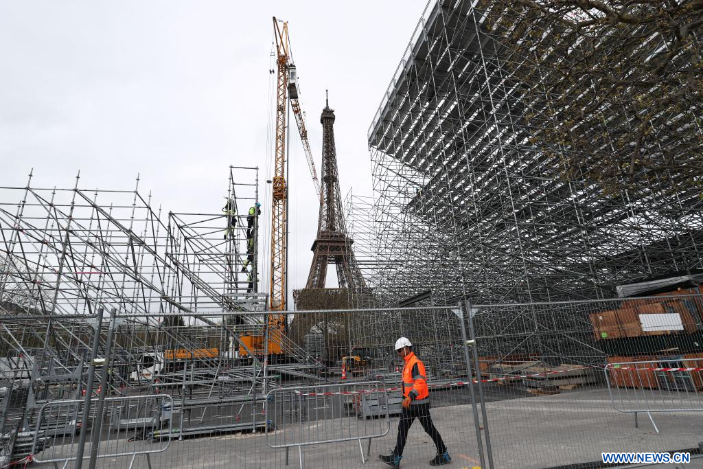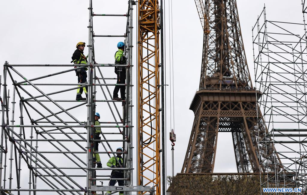 PARIS, 3 abril, 2024 (Xinhua) -- Imagen del 2 de abril de 2024 de trabajadores construyendo gradas para las obras de construcción Olímpica y Paralímpica en el Campo de Marte cerca de la Torre Eiffel, en París, Francia. (Xinhua/Gao Jing)