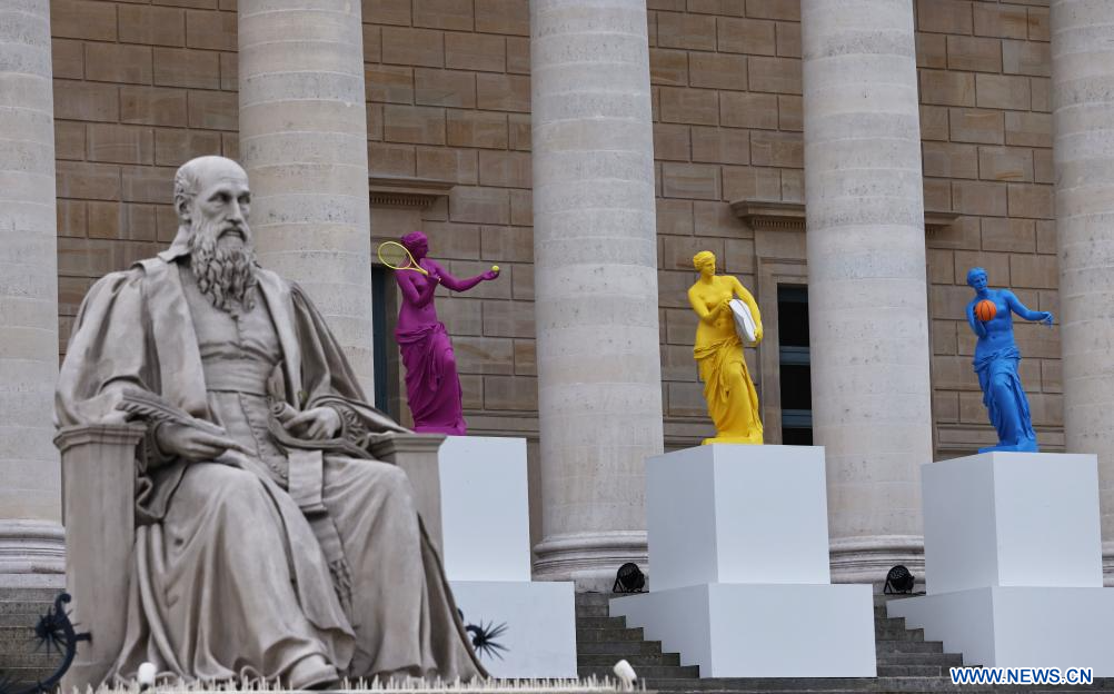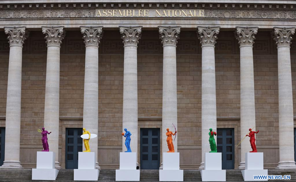 PARIS, 3 abril, 2024 (Xinhua) -- Imagen del 2 de abril de 2024 de esculturas con temática Olímpica y Paralímpica vistas frente a la Asamblea Nacional, en París, Francia. (Xinhua/Gao Jing)