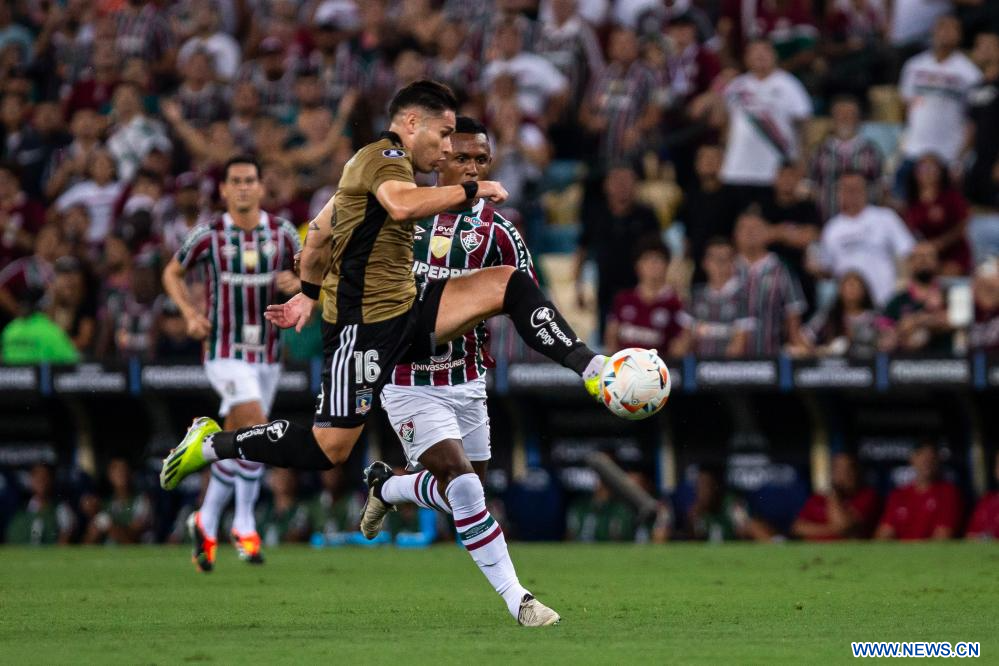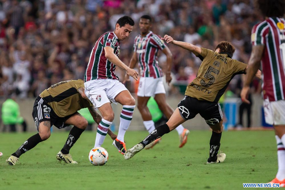 RÍO DE JANEIRO, 10 abril, 2024 (Xinhua) -- Imagen del 9 de abril de 2024 del jugador Marquinhos (atrás), de Fluminense de Brasil, disputando el balón con Oscar Opazo (frente), de Colo-Colo de Chile, durante el partido correspondiente a la segunda fecha del Grupo A de la Copa Conmebol Libertadores celebrado en el Estadio Maracaná, en Río de Janeiro, Brasil. (Xinhua/Claudia Martini)