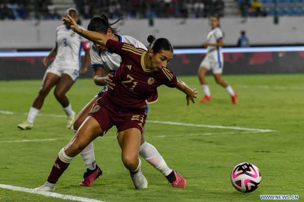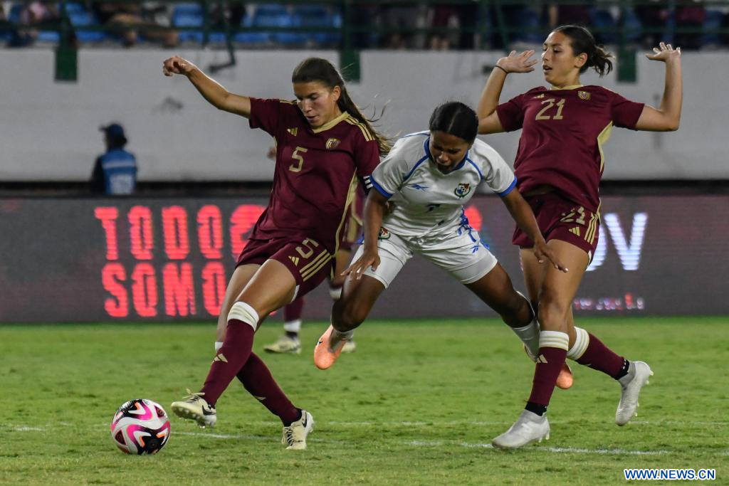 CARACAS, 9 abril, 2024 (Xinhua) -- Imagen del 8 de abril de 2024 de las jugadoras Yenifer Giménez (i) y Bárbara Olivieri (d), de Venezuela, disputando el balón con Alison Onodera (c), de Panamá, durante el partido amistoso internacional femenil celebrado en el Estadio Olímpico Nacional Brígido Iriarte, en Caracas, Venezuela. (Xinhua/Marcos Salgado)
