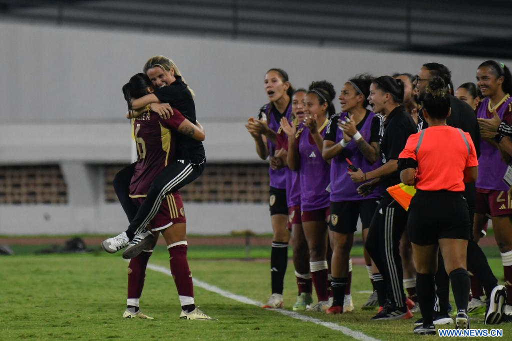 CARACAS, 9 abril, 2024 (Xinhua) -- Imagen del 8 de abril de 2024 de la jugadora Michelle Romero (i), de Venezuela, festejando una anotación con su directora técnica, Pamela Conti (2-i), durante el partido amistoso internacional femenil celebrado en el Estadio Olímpico Nacional Brígido Iriarte, en Caracas, Venezuela. (Xinhua/Marcos Salgado)