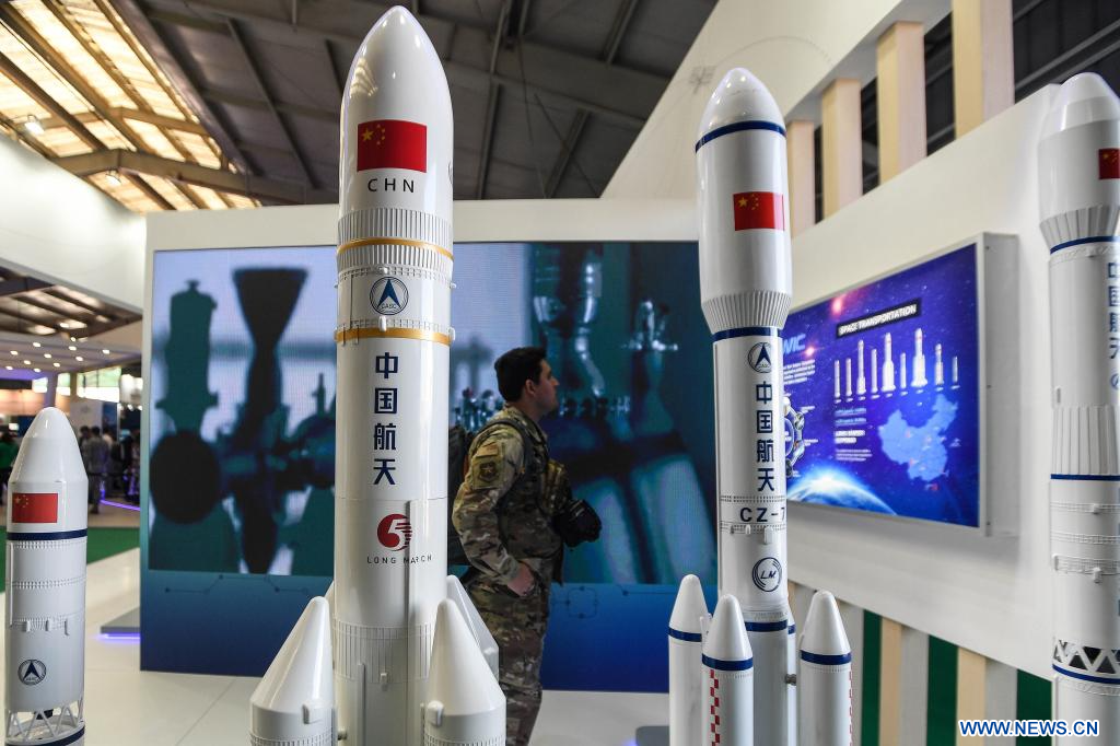 SANTIAGO, 10 abril, 2024 (Xinhua) -- Imagen del 9 de abril de 2024 de una persona visitando un estand de China en la Feria Internacional del Aire y del Espacio (FIDAE) 2024 de Chile, en Santiago, capital de Chile. La FIDAE 2024 de Chile, la principal exposición aeroespacial, de defensa y seguridad de América Latina, arrancó el martes, con 47 países participantes y 105 naves en exhibición, en su primera edición normalizada desde 2018. (Xinhua/Jorge Villegas)