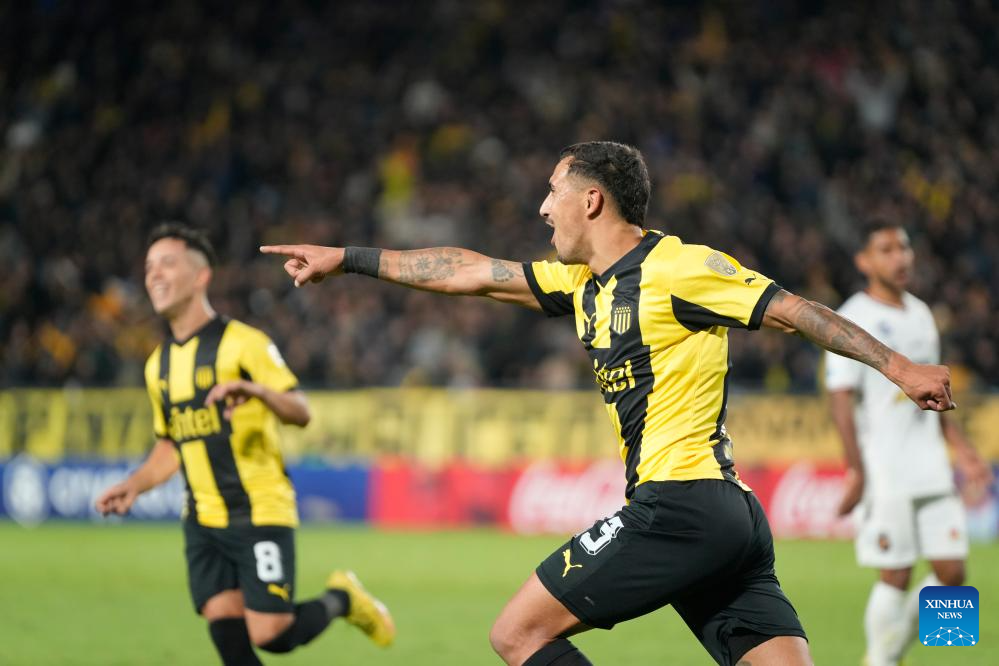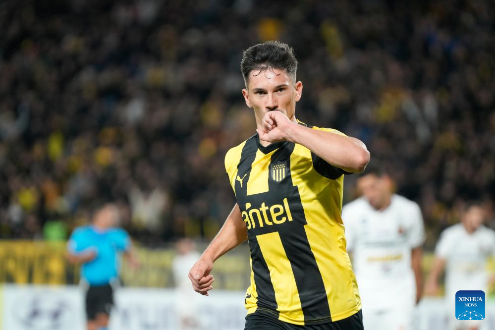 MONTEVIDEO, 11 abril, 2024 (Xinhua) -- Imagen del 10 de abril de 2024 del jugador Eduardo Darias, de Peñarol de Uruguay, festejando una anotación durante el partido correspondiente al Grupo G de la Copa Conmebol Libertadores, ante Caracas de Venezuela, celebrado en el estadio Campeón del Siglo, en Montevideo, capital de Uruguay. (Xinhua/Nicolás Celaya)