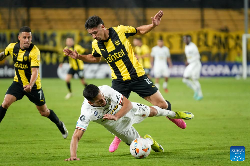 MONTEVIDEO, 11 abril, 2024 (Xinhua) -- Imagen del 10 de abril de 2024 del jugador Maximiliano Silvera (atrás), de Peñarol de Uruguay, disputando el balón con Renné Rivas (frente), de Caracas de Venezuela, durante el partido correspondiente al Grupo G de la Copa Conmebol Libertadores celebrado en el estadio Campeón del Siglo, en Montevideo, capital de Uruguay. (Xinhua/Nicolás Celaya)