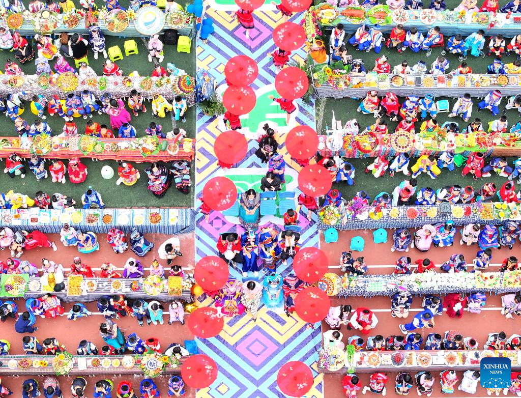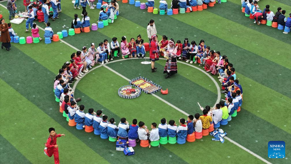 NANNING, 11 abril, 2024 (Xinhua) -- Imagen tomada con un dron el 10 de abril de 2024 de maestros y alumnos de una escuela primaria participando en una celebración del festival "Sanyuesan" en la ciudad de Qinzhou, en la región autónoma de la etnia zhuang de Guangxi, en el sur de China. Las personas del grupo étnico zhuang en Guangxi festejan el Festival Sanyuesan en el tercer día del tercer mes lunar portando trajes tradicionales y con entretenimientos tradicionales. El Festival Sanyuesan de este año cae el 11 de abril. (Xinhua/Zhang Ailin)