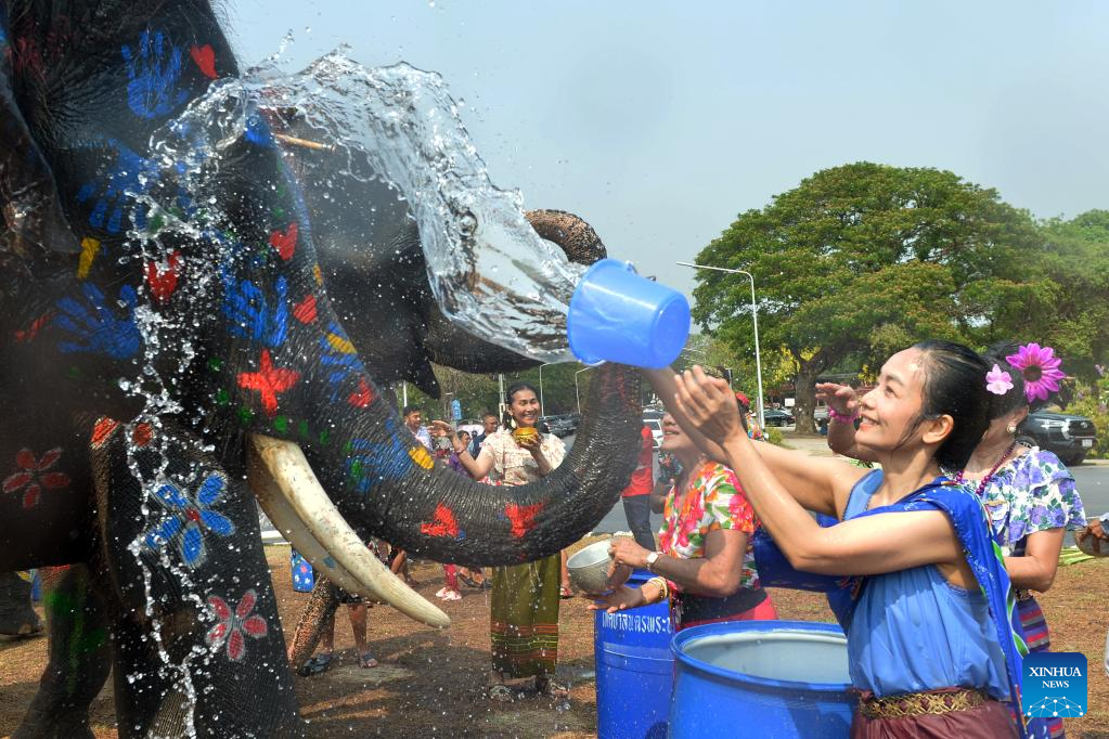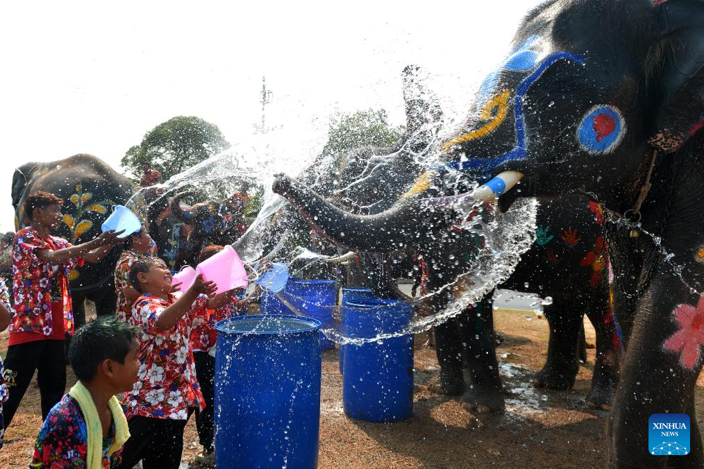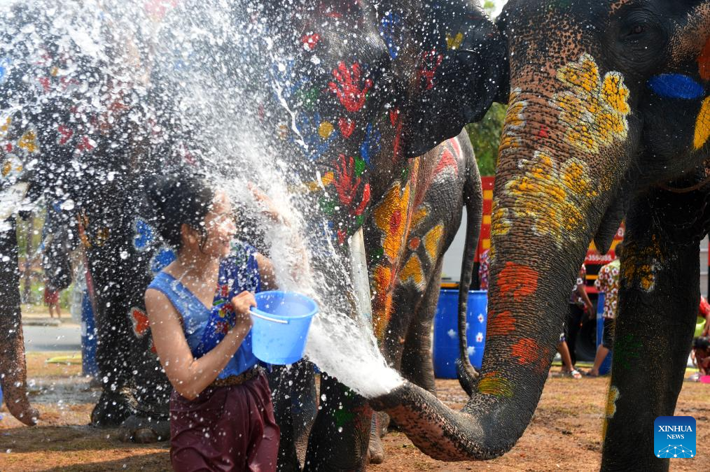 AYUTTHAYA, 11 abril, 2024 (Xinhua) -- Imagen del 9 de abril de 2024 de personas y elefantes salpicándose agua unos a otros para celebrar el próximo Festival Songkran, en Ayutthaya, Tailandia. El Festival Songkran, el tradicional Año Nuevo tailandés, es celebrado del 13 al 15 de abril de cada año, durante el cual las personas se saludan salpicándose agua unos a otros. (Xinhua/Rachen Sageamsak)