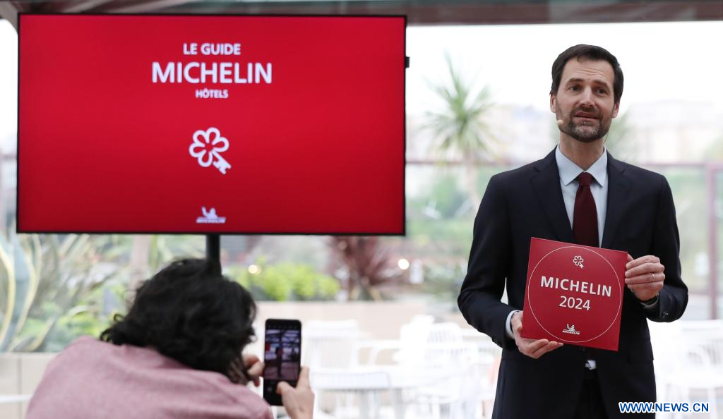 PARIS, 9 abril, 2024 (Xinhua) -- Imagen del 8 de abril de 2024 del director internacional de las Guías Michelin, Gwendal Poullennec, mostrando el panel de Una Llave MICHELIN durante una conferencia de prensa, en París, Francia. Michelin presentó la primera selección de Llaves MICHELIN en Francia el lunes. La última incorporación a los galardones de la Guía MICHELIN, las Llaves MICHELIN destacan los establecimientos de la selección de hoteles de la Guía que ofrecen las estancias más excepcionales. En esta primera lista, 189 hoteles y alojamientos, entre unos 600 establecimientos ya recomendados por la Guía MICHELIN de Francia, son galardonados con 24 Tres Llaves MICHELIN, 38 Dos Llaves MICHELIN y 127 Una Llave MICHELIN. (Xinhua/Gao Jing)