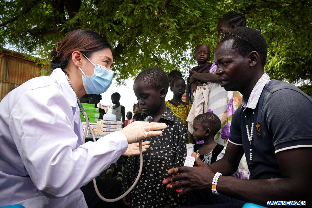 JUBA, 12 abril, 2024 (Xinhua) -- Imagen del 10 de abril de 2024 de doctores del 11 grupo del equipo médico chino brindando tratamiento gratuito a las personas, en la aldea de Nakitun, Juba, Sudán del Sur. (Xinhua/Han Xu)