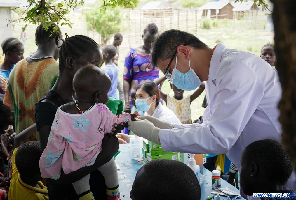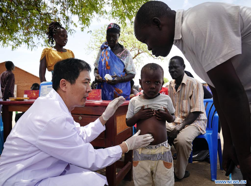 JUBA, 12 abril, 2024 (Xinhua) -- Imagen del 10 de abril de 2024 de un doctor del 11 grupo del equipo médico chino brindando tratamiento gratuito a una niña, en la aldea de Nakitun, Juba, Sudán del Sur. (Xinhua/Han Xu)