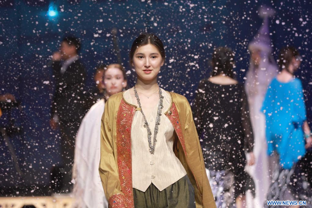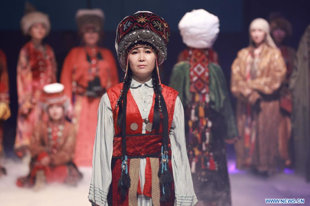 BISHKEK, 7 abril, 2024 (Xinhua) -- Imagen del 6 de abril de 2024 de modelos presentando creaciones durante un desfile de moda con elementos tradicionales de Kirguistán, en Bishkek, Kirguistán. (Xinhua/Roman Gainanov)