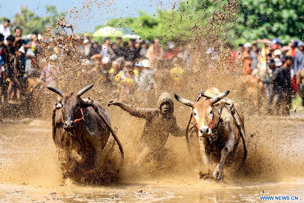 SUMATRA OCCIDENTAL, 13 abril, 2024 (Xinhua) -- Un hombre participa en el Pacu Jawi, una carrera de toros tradicional, en Nagari Labuah, en Tanah Datar de Sumatra Occidental, Indonesia, el 13 de abril de 2024. El Pacu Jawi se celebra anualmente en campos de arroz fangosos para celebrar el final de la temporada de cosecha. (Xinhua/Yorri Farli)