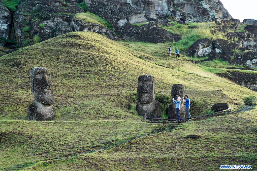 ISLA DE PASCUA, 9 abril, 2024 (Xinhua) -- Imagen del 5 de abril de 2024 de turistas tomando fotografías de las estatuas de piedra moái, en la Isla de Pascua de Chile. La Isla de Pascua, conocida por sus gigantescas cabezas talladas en piedra que miran hacia el mar, está situada en el punto más meridional del Triángulo Polinesio, en el Pacífico Sur, y se considera una de las regiones habitadas más remotas del mundo. (Xinhua/Zhu Yubo)