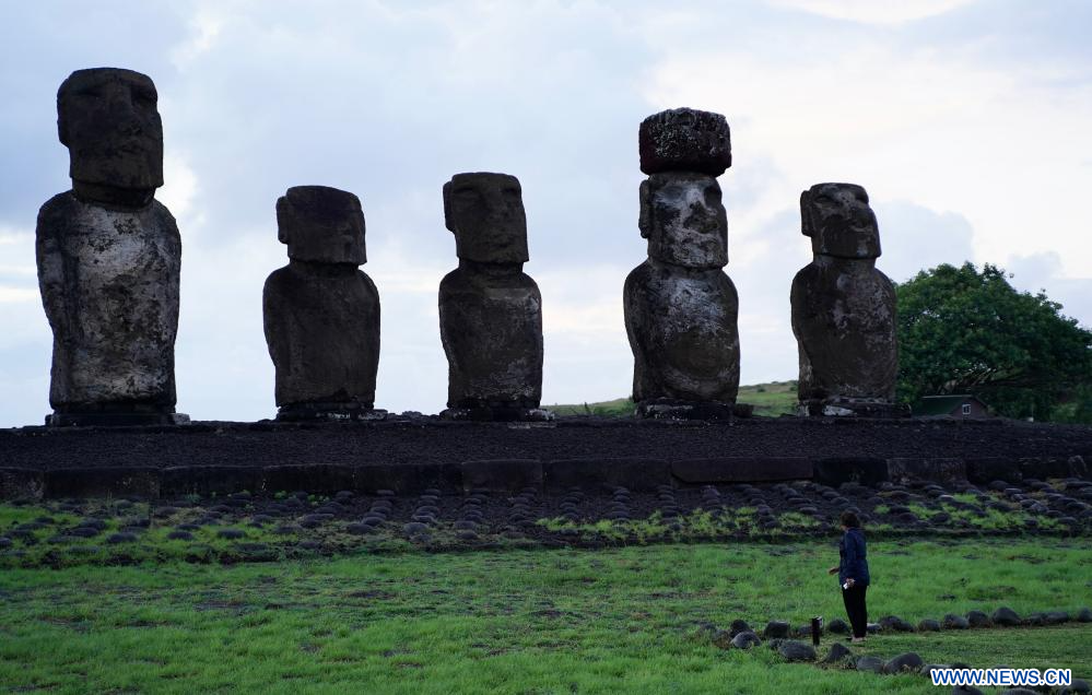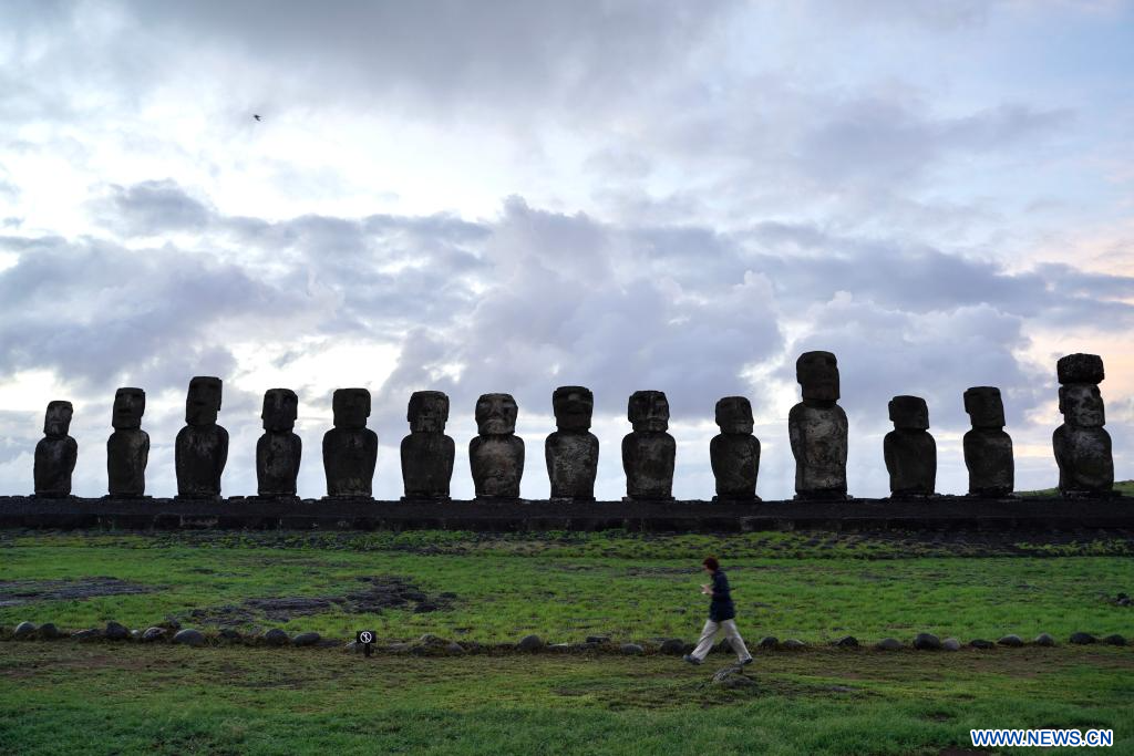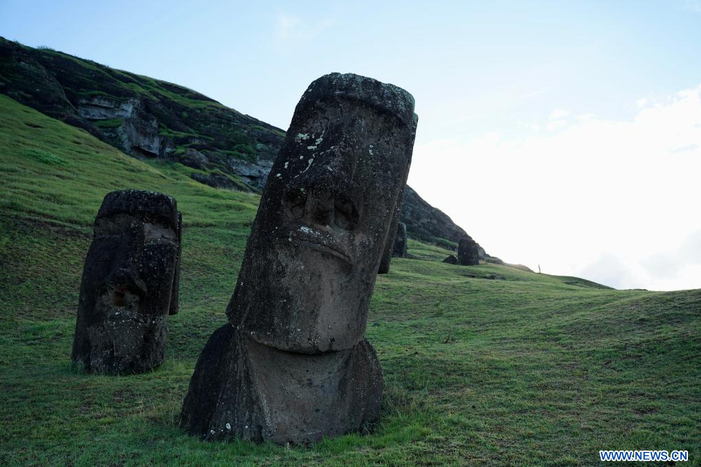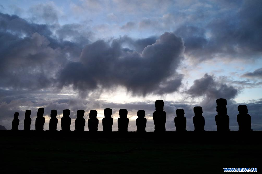 ISLA DE PASCUA, 9 abril, 2024 (Xinhua) -- Imagen del 5 de abril de 2024 de estatuas de piedra moái, en la Isla de Pascua de Chile. La Isla de Pascua, conocida por sus gigantescas cabezas talladas en piedra que miran hacia el mar, está situada en el punto más meridional del Triángulo Polinesio, en el Pacífico Sur, y se considera una de las regiones habitadas más remotas del mundo. (Xinhua/Zhu Yubo)