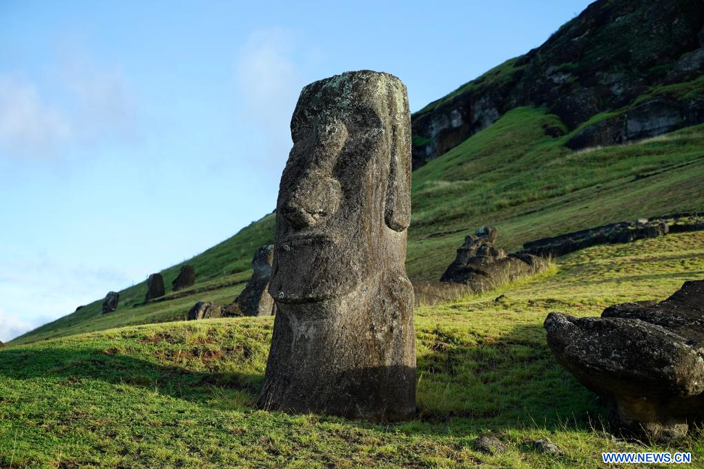 ISLA DE PASCUA, 9 abril, 2024 (Xinhua) -- Imagen del 5 de abril de 2024 de una estatua de piedra moái, en la Isla de Pascua de Chile. La Isla de Pascua, conocida por sus gigantescas cabezas talladas en piedra que miran hacia el mar, está situada en el punto más meridional del Triángulo Polinesio, en el Pacífico Sur, y se considera una de las regiones habitadas más remotas del mundo. (Xinhua/Zhu Yubo)
