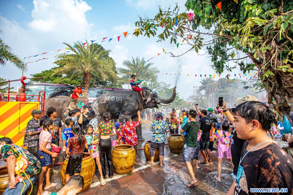 AYUTTHAYA, 13 abril, 2024 (Xinhua) -- Personas y elefantes salpican agua en celebración del Festival Songkran, en Ayutthaya, Tailandia, el 13 de abril de 2024. El Festival Songkran, el tradicional Año Nuevo tailandés, es celebrado del 13 al 15 de abril de cada año, durante el cual las personas se saludan salpicándose agua unos a otros. (Xinhua/Wang Teng)