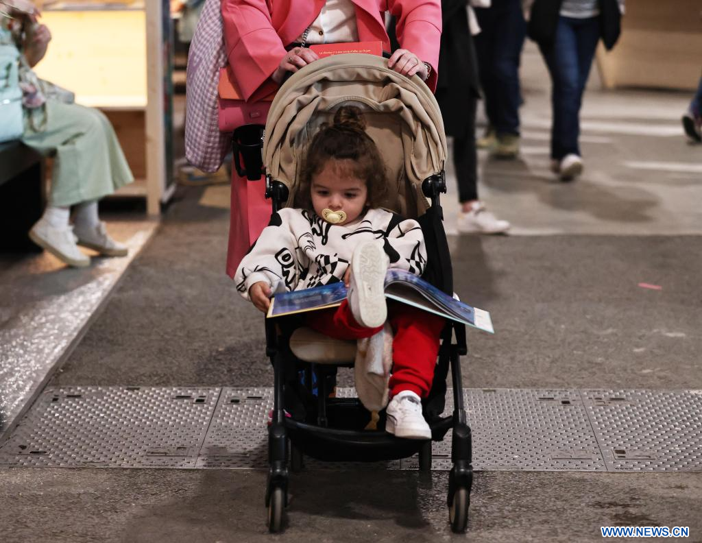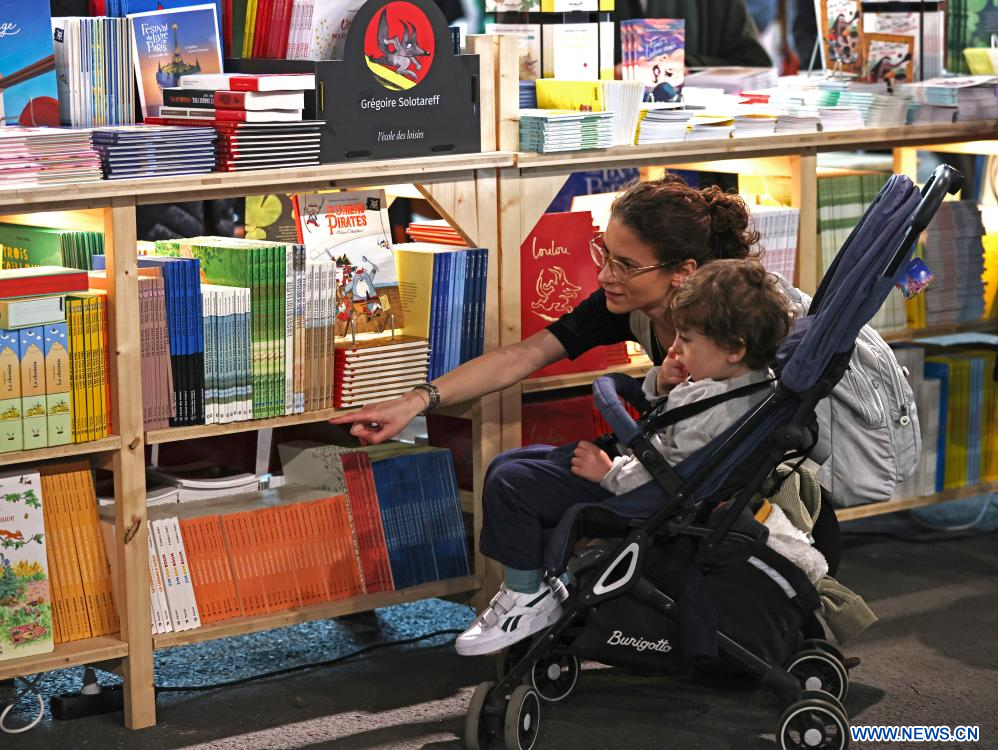 PARIS, 13 abril, 2024 (Xinhua) -- Imagen el 12 de abril de 2024 de una niña leyendo un libro en el Festival del Libro de París 2024, en París, Francia. El festival del libro se inauguró el viernes y durará tres días. (Xinhua/Gao Jing)