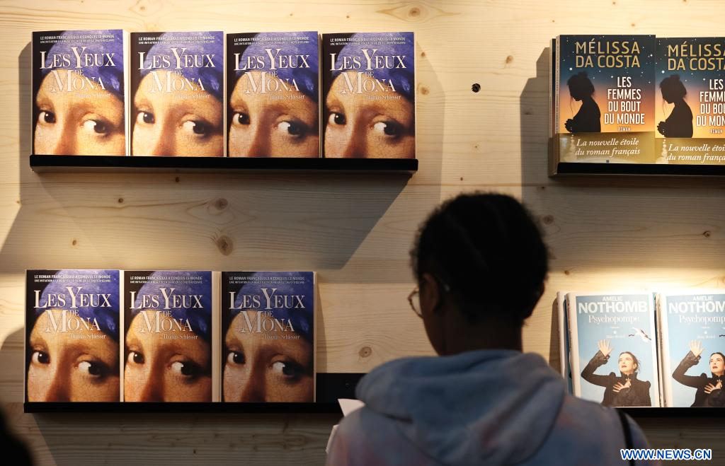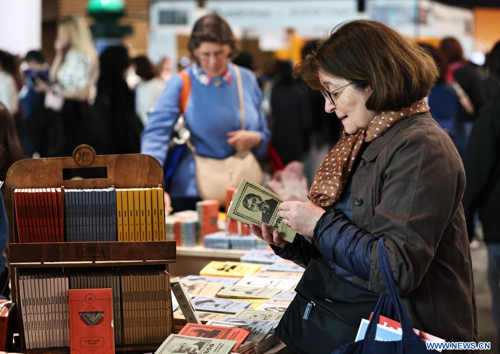 PARIS, 13 abril, 2024 (Xinhua) -- Imagen el 12 de abril de 2024 de un visitante leyendo un libro en el Festival del Libro de París 2024, en París, Francia. El festival del libro se inauguró el viernes y durará tres días. (Xinhua/Gao Jing)