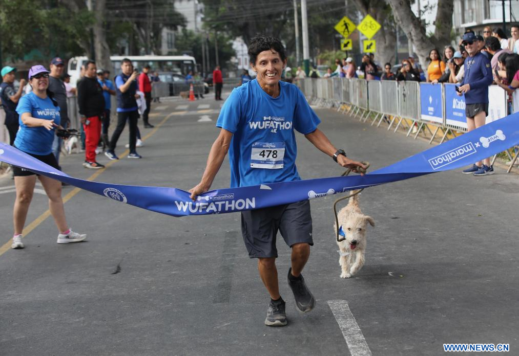 LIMA, 14 abril, 2024 (Xinhua) -- Un deportista y su perro cruzan la línea de meta del evento "Trote y Caminata Wufathon 4k", en el distrito de Barranco, en Lima, Perú, el 14 de abril de 2024. (Xinhua/Mariana Bazo)