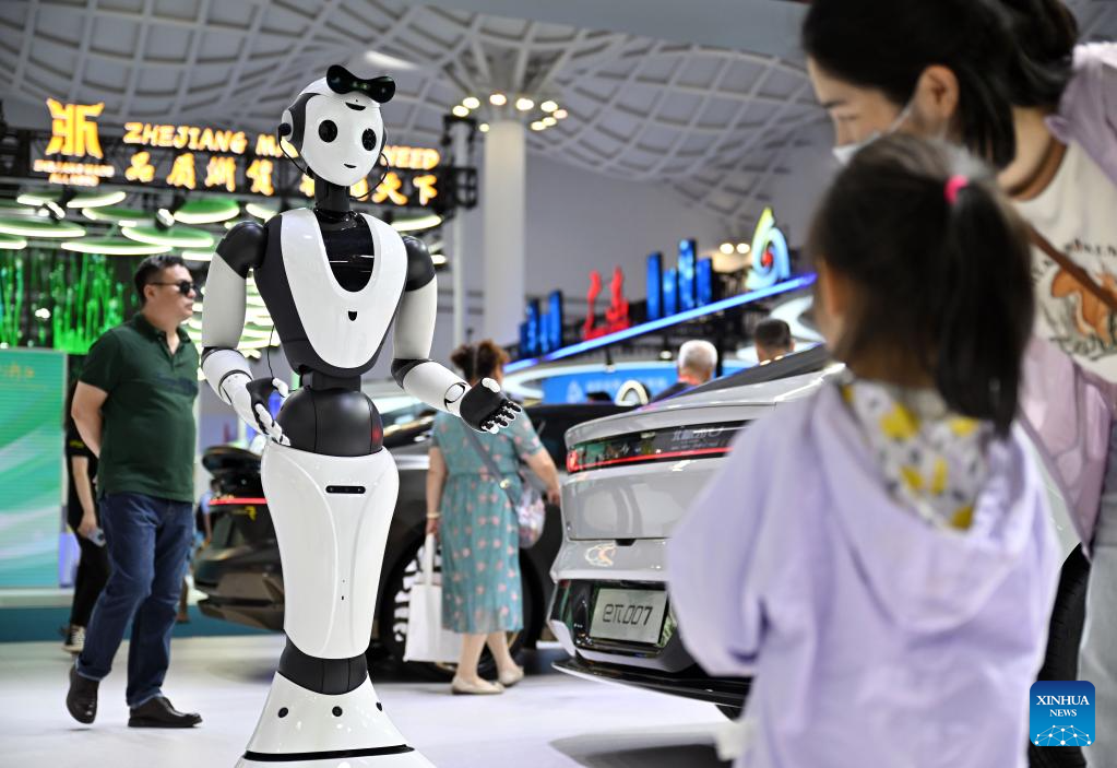 HAIKOU, 15 abril, 2024 (Xinhua) -- Personas interactúan con un robot de inteligencia artificial (IA) en la IV Exposición Internacional de Productos de Consumo de China (CICPE, por sus siglas en inglés), en Haikou, ciudad capital de la provincia de Hainan, en el sur de China, el 15 de abril de 2024. Del 13 al 18 de abril, la exposición, con el tema "Compartir oportunidades abiertas, co-crear una vida mejor", albergará a más de 4.000 marcas de 71 países y regiones, mostrando sus productos novedosos y de lujo para los consumidores de todo el mundo. (Xinhua/Guo Cheng)