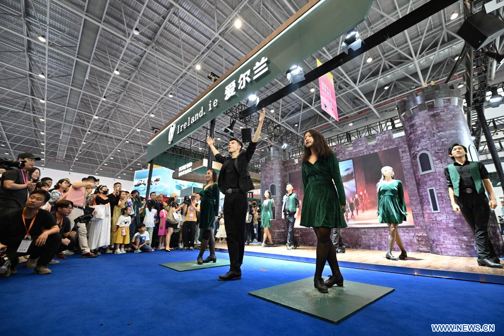 HAIKOU, 14 abril, 2024 (Xinhua) -- Artistas realizan una danza de tap en el pabellón nacional de Irlanda durante la IV Exposición Internacional de Productos de Consumo de China (CICPE, por sus siglas en inglés), en Haikou, capital de la provincia de Hainan, en el sur de China, el 14 de abril de 2024. Del 13 al 18 de abril, la exposición, con el tema "Compartir oportunidades abiertas, co-crear una vida mejor", albergará a más de 4.000 marcas de 71 países y regiones, mostrando sus productos novedosos y de lujo para los consumidores de todo el mundo. Irlanda es el invitado de honor en la exposición de este año, con un lugar de exposición dedicado que muestra la innovación científica y tecnológica, la educación, la inversión, el turismo y la cultura del país. (Xinhua/Guo Cheng)
