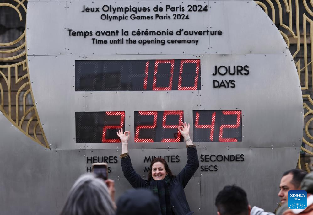 PARÍS, 18 abril, 2024 (Xinhua) -- Imagen del 17 de abril de 2024 de una turista posando para fotografías con un reloj de cuenta regresiva para los Juegos Olímpicos de París 2024 frente a la Torre Eiffel, en París, Francia. (Xinhua/Gao Jing)