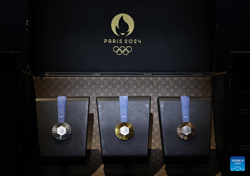 PARÍS, 18 abril, 2024 (Xinhua) -- Imagen del 17 de abril de 2024 de las medallas olímpicas de París exhibidas durante una ceremonia para celebrar la cuenta regresiva de 100 días para los Juegos Olímpicos de París 2024 en el recinto del Gran Palacio Efímero, en París, Francia. (Xinhua/Gao Jing)