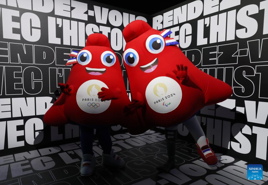 PARÍS, 18 abril, 2024 (Xinhua) -- Imagen del 17 de abril de 2024 de las mascotas de los Juegos Olímpicos y Paralímpicos de París vistas durante una ceremonia para celebrar la cuenta regresiva de 100 días para los Juegos Olímpicos de París 2024 en el recinto del Gran Palacio Efímero, en París, Francia. (Xinhua/Gao Jing)