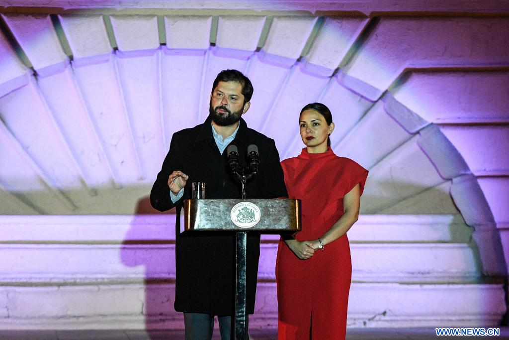 Imagen del 17 de abril de 2024 del presidente chileno, Gabriel Boric (i), y la ministra de las Culturas, las Artes y el Patrimonio chilena, Carolina Arredondo Marzán (d), participando durante la inauguración del Mercado de Industrias Culturales del Sur (Micsur) en el frontis del Museo de Arte Contemporáneo, en Santiago, capital de Chile. Una década de trabajo cumple el Micsur, que convoca esta vez en Chile a más de 330 autoridades y representantes de la cultura de nueve países sudamericanos, adheridos al Mercado Común del Sur, para instalar una agenda colaborativa que trascienda fronteras e intercambiar experiencias de desarrollo de los ecosistemas creativos de la región. (Xinhua/Jorge Villegas)