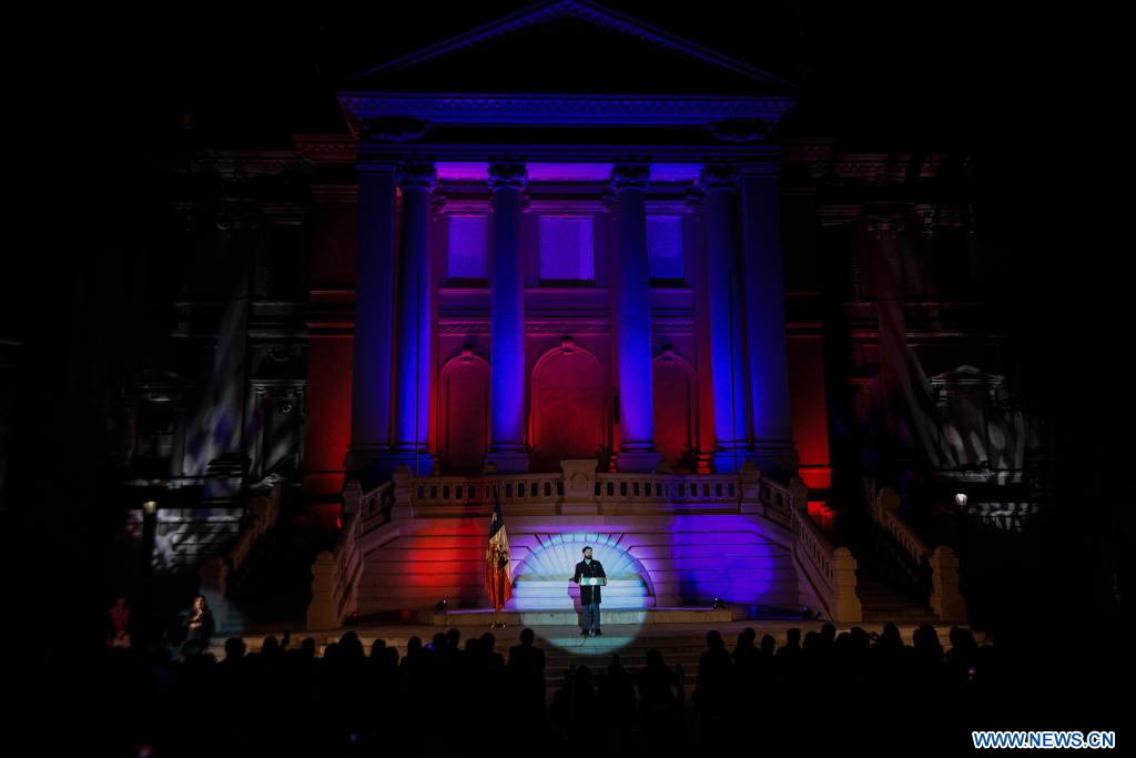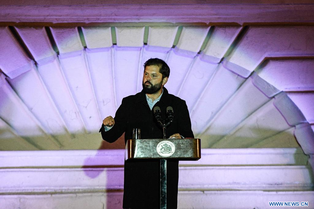 Imagen del 17 de abril de 2024 del presidente chileno, Gabriel Boric, hablando durante la inauguración del Mercado de Industrias Culturales del Sur (Micsur) en el frontis del Museo de Arte Contemporáneo, en Santiago, capital de Chile. Una década de trabajo cumple el Micsur, que convoca esta vez en Chile a más de 330 autoridades y representantes de la cultura de nueve países sudamericanos, adheridos al Mercado Común del Sur, para instalar una agenda colaborativa que trascienda fronteras e intercambiar experiencias de desarrollo de los ecosistemas creativos de la región. (Xinhua/Jorge Villegas)