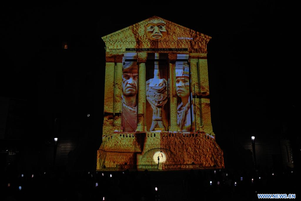 Imagen del 17 de abril de 2024 una artista realizando una presentación durante la inauguración del Mercado de Industrias Culturales del Sur (Micsur) en el frontis del Museo de Arte Contemporáneo, en Santiago, capital de Chile. Una década de trabajo cumple el Micsur, que convoca esta vez en Chile a más de 330 autoridades y representantes de la cultura de nueve países sudamericanos, adheridos al Mercado Común del Sur, para instalar una agenda colaborativa que trascienda fronteras e intercambiar experiencias de desarrollo de los ecosistemas creativos de la región. (Xinhua/Jorge Villegas)