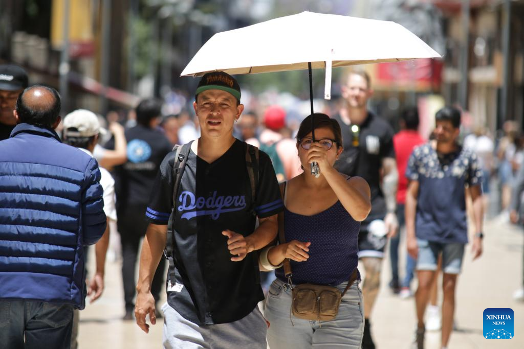CIUDAD DE MEXICO, 17 abril, 2024 (Xinhua) -- Imagen del 16 de abril de 2024 de dos peatones protegiéndose del sol con una sombrilla, en la Ciudad de México, México. (Xinhua/Francisco Cañedo)