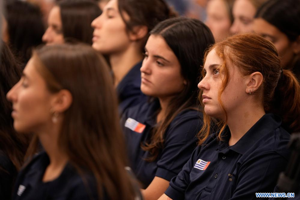 Imagen del 17 de abril de 2024 de integrantes de la selección juvenil de hockey sobre césped femenino participando en la ceremonia de entrega oficial del pabellón uruguayo a su delegación que viajará a China en el marco del acuerdo de cooperación bilateral firmado entre Uruguay y China, en Montevideo, capital de Uruguay. El deporte de Uruguay busca dar un salto de calidad con la partida a China de unos 200 deportistas y entrenadores, que entrenarán en centros de alto rendimiento del país asiático entre abril y octubre de este año, en el marco del acuerdo de cooperación bilateral firmado por los gobiernos de ambas naciones. (Xinhua/Nicolás Celaya)