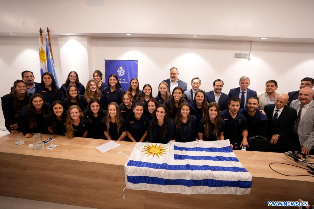 Imagen del 17 de abril de 2024 de integrantes de la selección juvenil de hockey sobre césped femenino posando para una fotografía grupal con autoridades durante la ceremonia de entrega oficial del pabellón uruguayo a su delegación que viajará a China en el marco del acuerdo de cooperación bilateral firmado entre Uruguay y China, en Montevideo, capital de Uruguay. El deporte de Uruguay busca dar un salto de calidad con la partida a China de unos 200 deportistas y entrenadores, que entrenarán en centros de alto rendimiento del país asiático entre abril y octubre de este año, en el marco del acuerdo de cooperación bilateral firmado por los gobiernos de ambas naciones. (Xinhua/Nicolás Celaya)