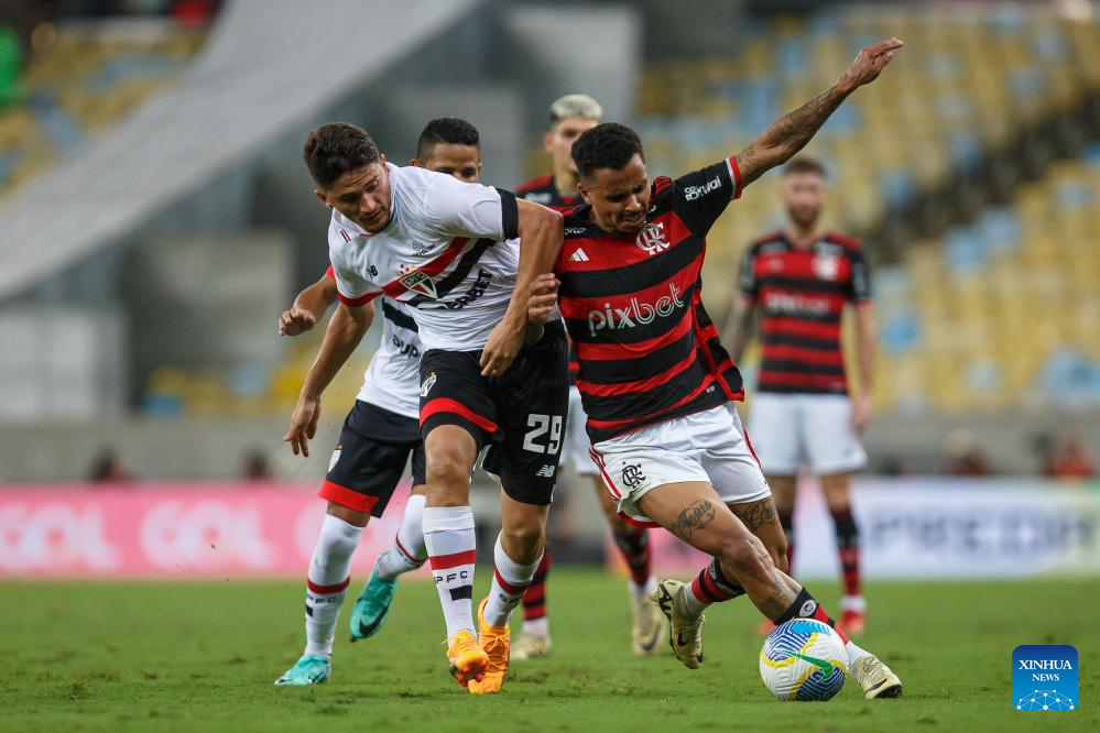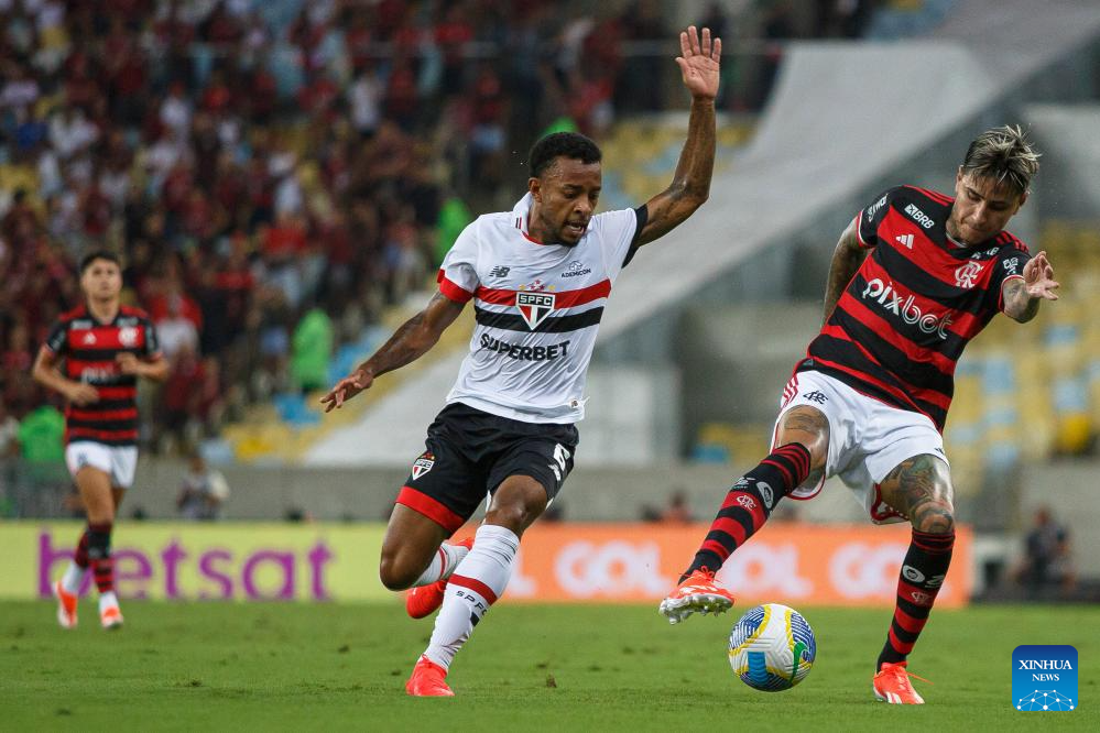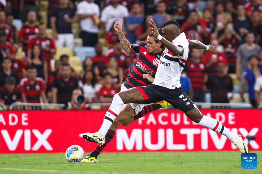 RÍO DE JANEIRO, 18 abril, 2024 (Xinhua) -- Imagen del 17 de abril de 2024 del jugador Pedro (atrás), de Flamengo, disputando el balón con Arboleda (frente), de Sao Paulo, durante el partido correspondiente a la jornada 2 del Campeonato Brasileño Serie A, celebrado en el Estadio Maracaná, en Río de Janeiro, Brasil. (Xinhua/Claudia Martini)