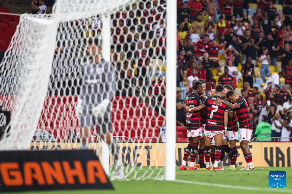 RÍO DE JANEIRO, 18 abril, 2024 (Xinhua) -- Imagen del 17 de abril de 2024 de jugadores de Flamengo festejando una anotación durante el partido correspondiente a la jornada 2 del Campeonato Brasileño Serie A, ante Sao Paulo, celebrado en el Estadio Maracaná, en Río de Janeiro, Brasil. (Xinhua/Claudia Martini)