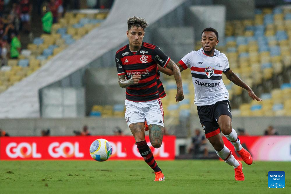 RÍO DE JANEIRO, 18 abril, 2024 (Xinhua) -- Imagen del 17 de abril de 2024 del jugador Erick Pulgar (i), de Flamengo, disputando el balón con Wellington (d), de Sao Paulo, durante el partido correspondiente a la jornada 2 del Campeonato Brasileño Serie A, celebrado en el Estadio Maracaná, en Río de Janeiro, Brasil. (Xinhua/Claudia Martini) (cm) (rtg) (ra) (vf)